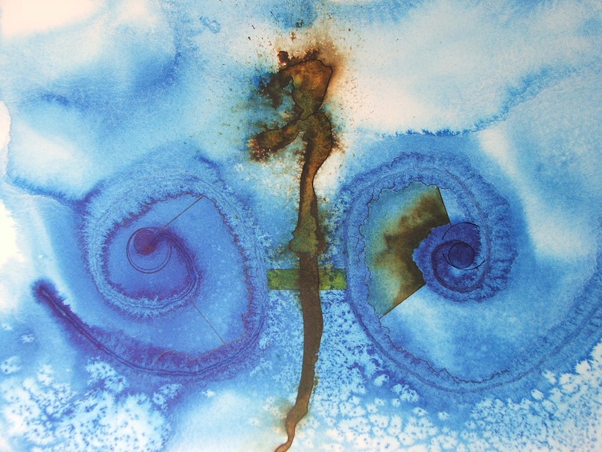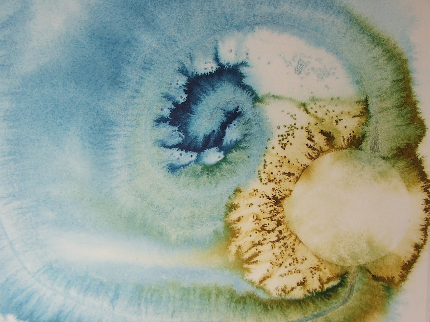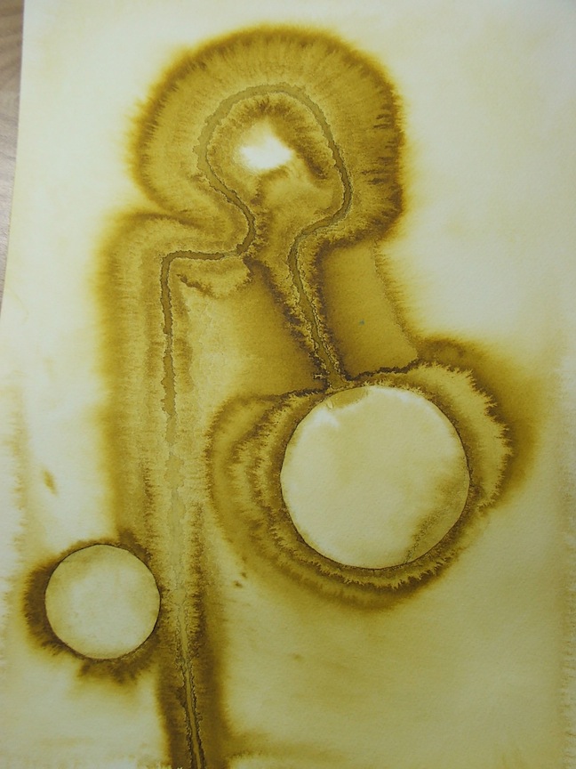 I also add to my stains patterns, strings and other surface fibers like gauze, which holds the water longer and gives other affects while drying. As the paper further away from the line of drying starts to migrate back towards the wetter areas, the strings, patterns and surfaces continue to hydrate areas, which gives the paper affects as it dries. Salt, sugar and other additives have to be placed on the paper when it is not totally soaked, or the salt just merges with the water. But also not too dry or the salt does not pull pigment to itself.
