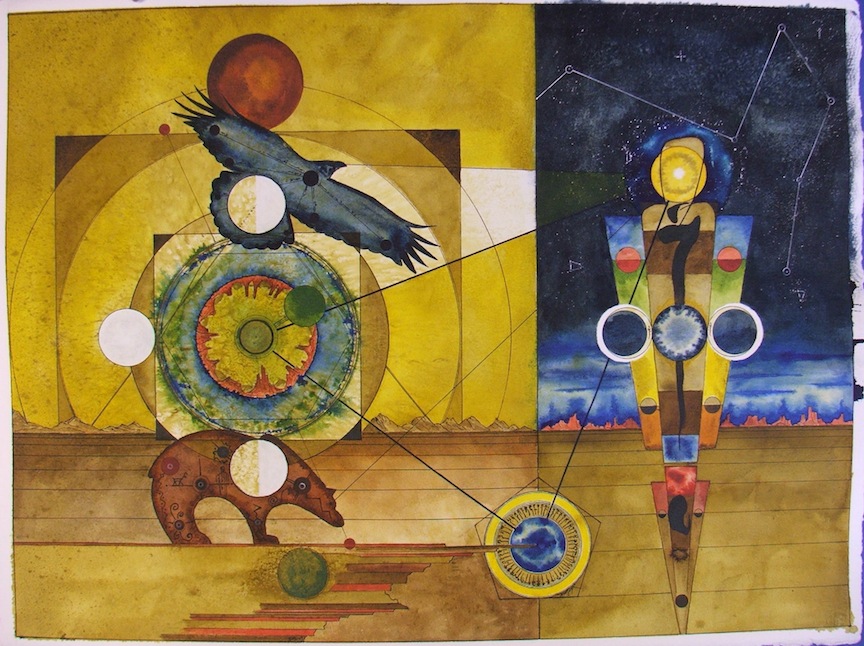 The Raven calls the people in ceremony to ecstasis. She flies across the cosmos between the worlds and within our selves to places unknown and unknowable. All sacred spots honored the raven or birds of some kind as the soul, the etheric body, that can dream of new possibilities. Thus the raven here flies connected to the sun and earth as it spirals to something awesome.