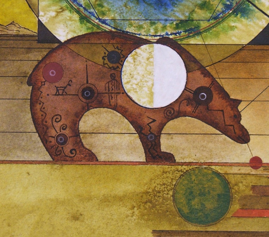 To the lower part of the lodge is the bear. I chose this symbol for numerous reasons to carry the lodge. The bear was and is considered the equal to man for the native elders. The bear became the one animal that the natives considered most human. They easily killed humans and at the same time with observation led the healers to herbs and plants necessary for our survival. The bear is also immortalized in the sky as the little and big dippers. To the europeans, the dragon was a mythical animal above all animals. The star pattern of the dragon surounds the north star as we cycle through the year… With his helpers the bear we hold the mysteries of healing and holding sacred space. The bear and the dragon are the active principles of the earth energies of creation. Within the bear are circles and spirals and figures like those drawn on the rocks. When we step back we can understand these pictures for what they were, maps to water, hunting locations and sacred spots. A record and a declaration of what was located near these record stones.