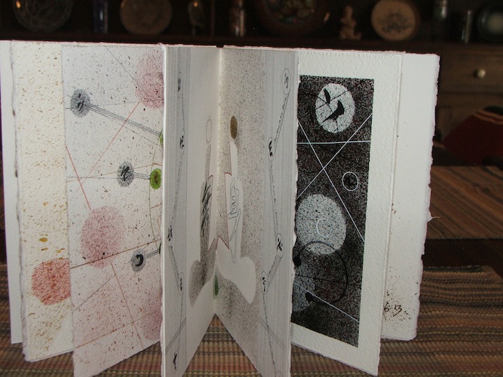 - As this project developed, the process was to take quarter sheets of 22×30 paper and fold them. Using drum leaf binding, the folios were glued one to the other. Then the covers were added. This was completed before the images were done within the book. This gives the Drum Leaf binding an advantage over other bindings. The pages, being double thick allow the artist to work, paint etc on the pages after the book is bound… building up ideas into the final presentation.