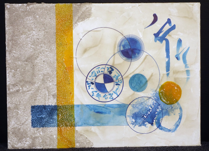 Moon Beam is a technique of adding Japanese paper to a canvas board. Because the media is used as a glue below the paper, the paper stays receptive to some amazing additions of color right into the fibers of the paper. This presents the artist with a method of drawing on papers or adding papers and then using watercolor techniques as a layer for a painting. My love of paper and paper fiber has brought this technique into almost all of my paintings. And it offers that linear and geometric feel which I like to be added at any point in the process of painting. The upper and lower boarders are unfinished, but are made of sand. Thus one can see various techniques being added together.