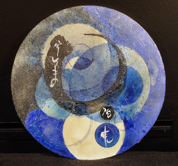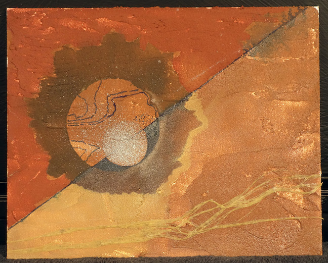 Molding Paste comes in several varieties each with different potentials. Here three of them, light, medium and heavy, from left to right, are combined together to produce an interesting variable effect in each being. After it dries, color can be added with varying reflections and surface tension. The light molding past is porous and receives the paint. The medium has a bit of a resistance and the heavy is like working in hard clay. The circle is a combination of fiber paste and color. The background for this work was a light wash in ink disturbed with water. Then the molding paste was added. Thus even the canvas can be stained before working on the ideas.