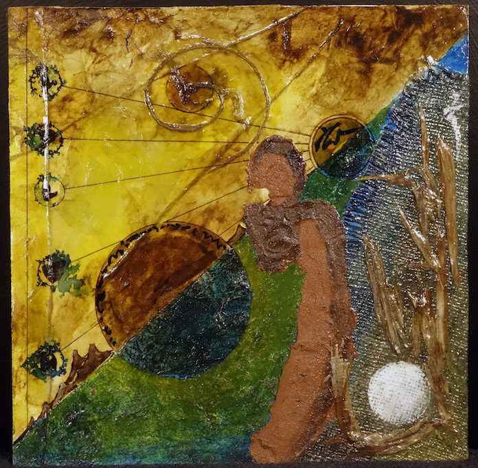Finally, this last work is a completed work with a ton of mixed media and ideas all together. Sand, dirts, fibers, cloth, even tree bark is added into this work with ink, paint and varnish techniques.