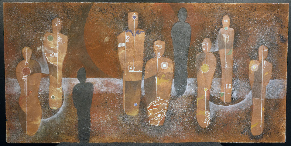 Modern Ancients is a completed work using the sand technique, layers of stainless steel paint, sepia, and red oxide as well as paynes gray, and pearl media. The last layer was the white lines which are added using an inking tool to get precise lines.