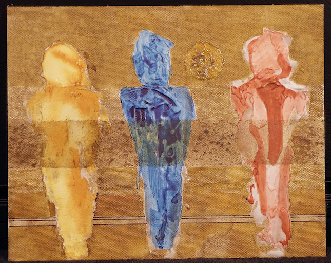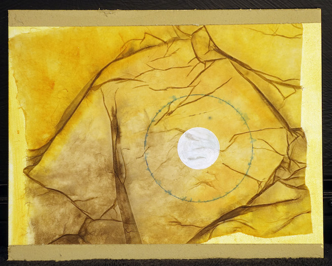Again, here is the technique in a finished work. Also added are Amate fibers, detailed painting with inks and drafting tools, areas of wash, and manipulated paper. The final layer is a thin layer of GAC800 which acts as a varnish to protect the paper. And thus this work can be framed without glass yet still communicate what paper communicates to the viewer. Last, a fig leaf is added using extra heavy gel media. It takes several days for this to completely dry, but when it does, the leaf shines through. Being trapped within the layers, the leaf is stable. To limit its breakdown over time, Golden has created a UV varnish as a last layer when a work is complete. Again, Golden lives up to its name.