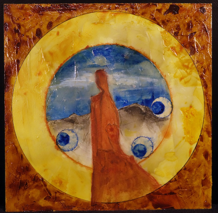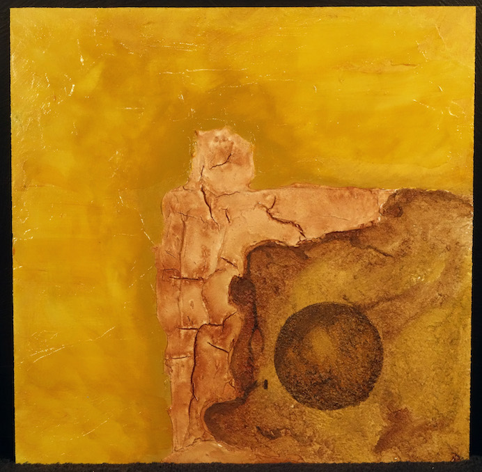Crackle paste and fiber paste contrast here to allow a different voice. The thicker the crackle the more dramatic the cracks. One can control the cracking a bit by adding in GAC100, but in general its a great medium for extreme texture. The watered down read then flows into the cracks which accent them. Fiber past is probably my favorite medium to add to a painting. It gives me extreme texture to play with and takes watercolor style stains and layers. Around the work, in the sky as it were, yellows are layered one on top of the other using a glazing technique. Then heavy gel is layered without color, allowed to dry and then more glazing. Thus one can manipulate the light affects in a work.